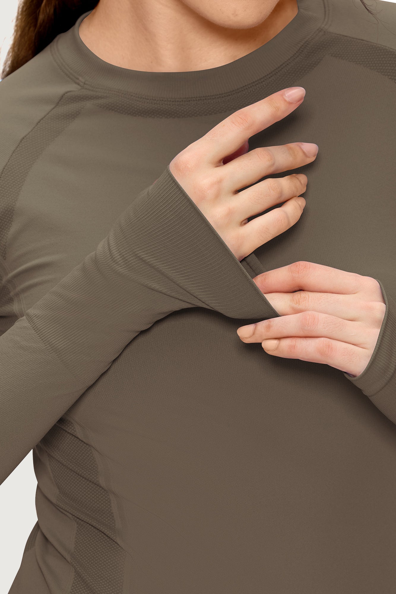 Thoughtful Details: Higher crew neck for secure coverage, thumb-hole sleeves that stay put, and a clean, contoured fit.